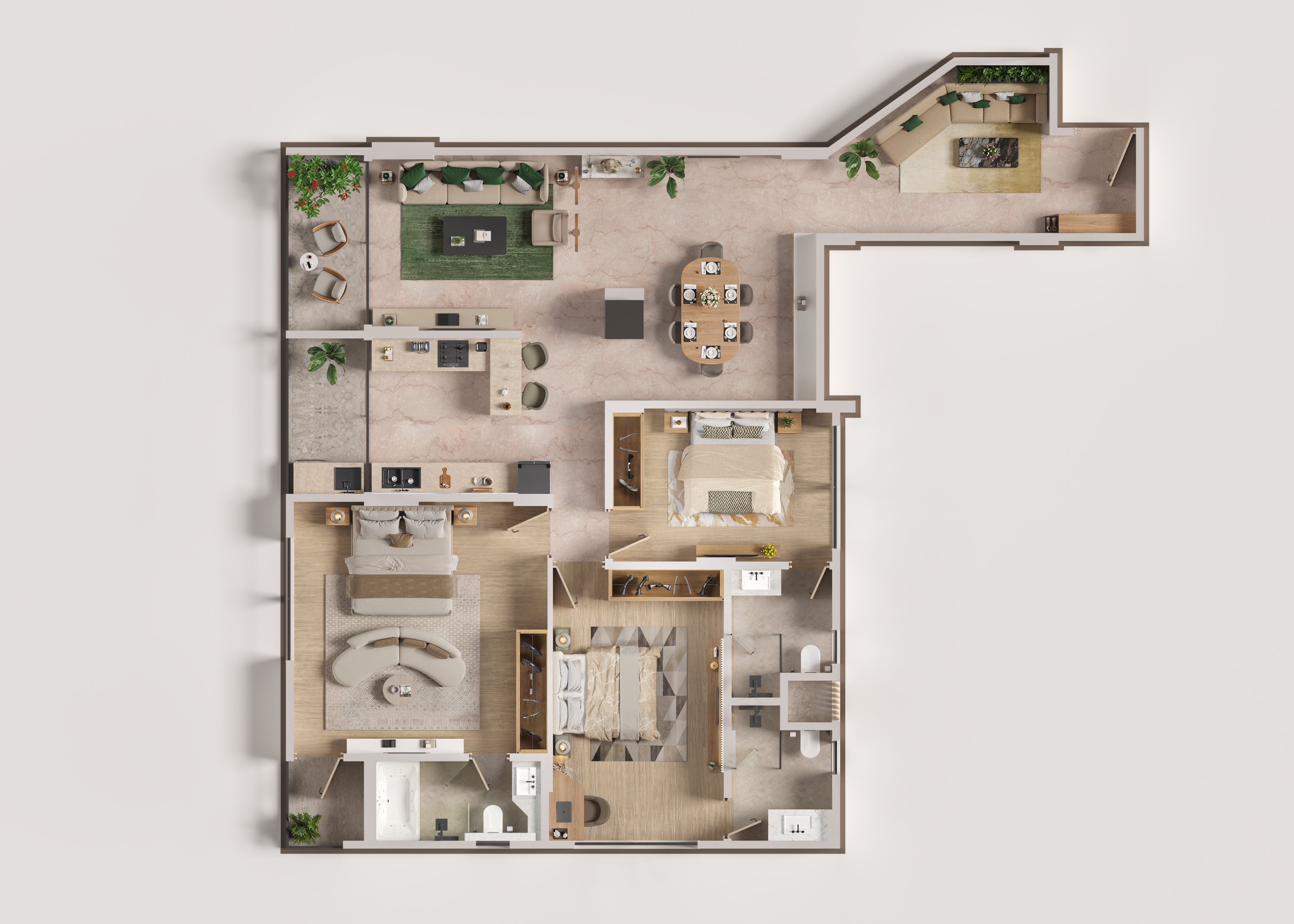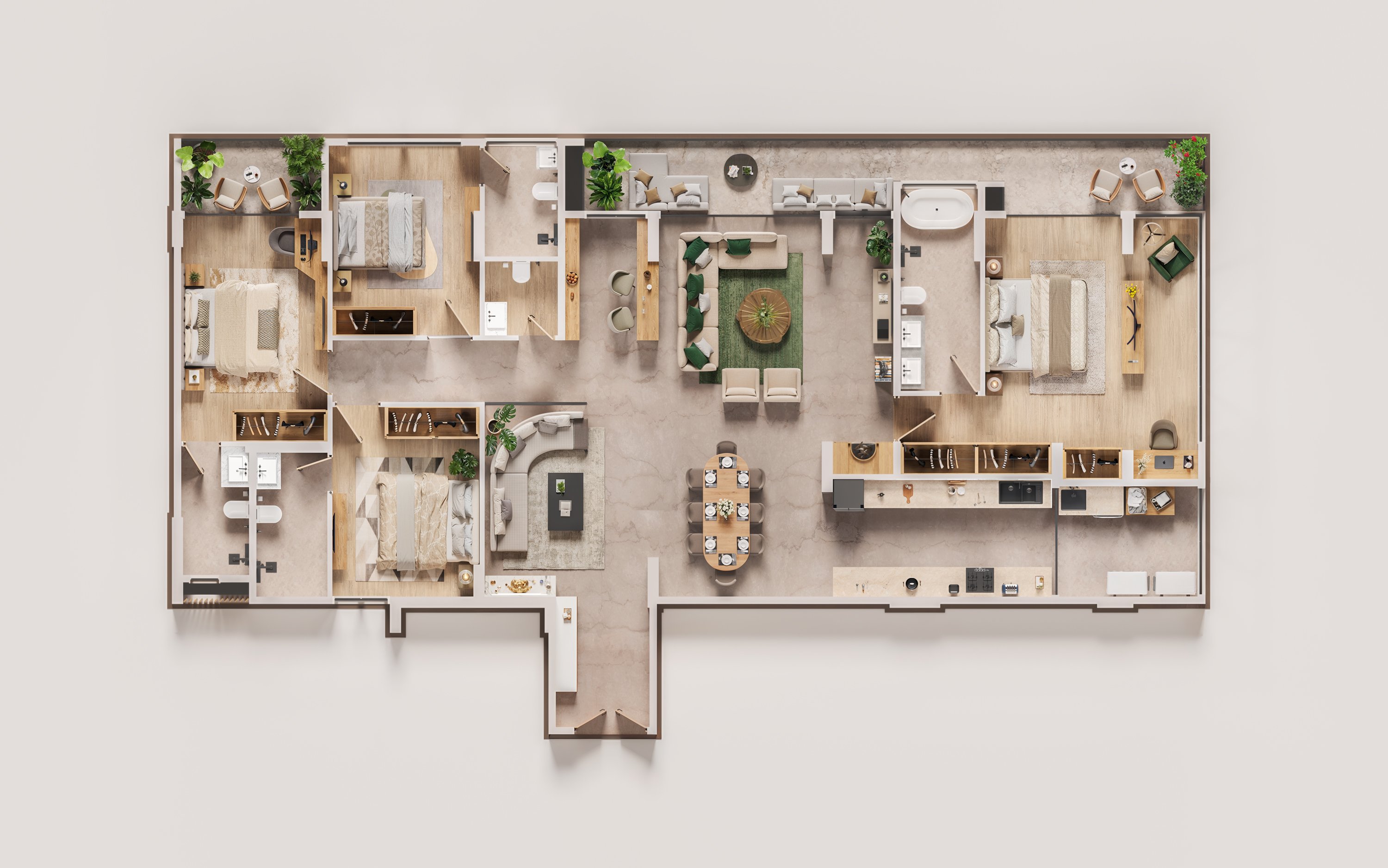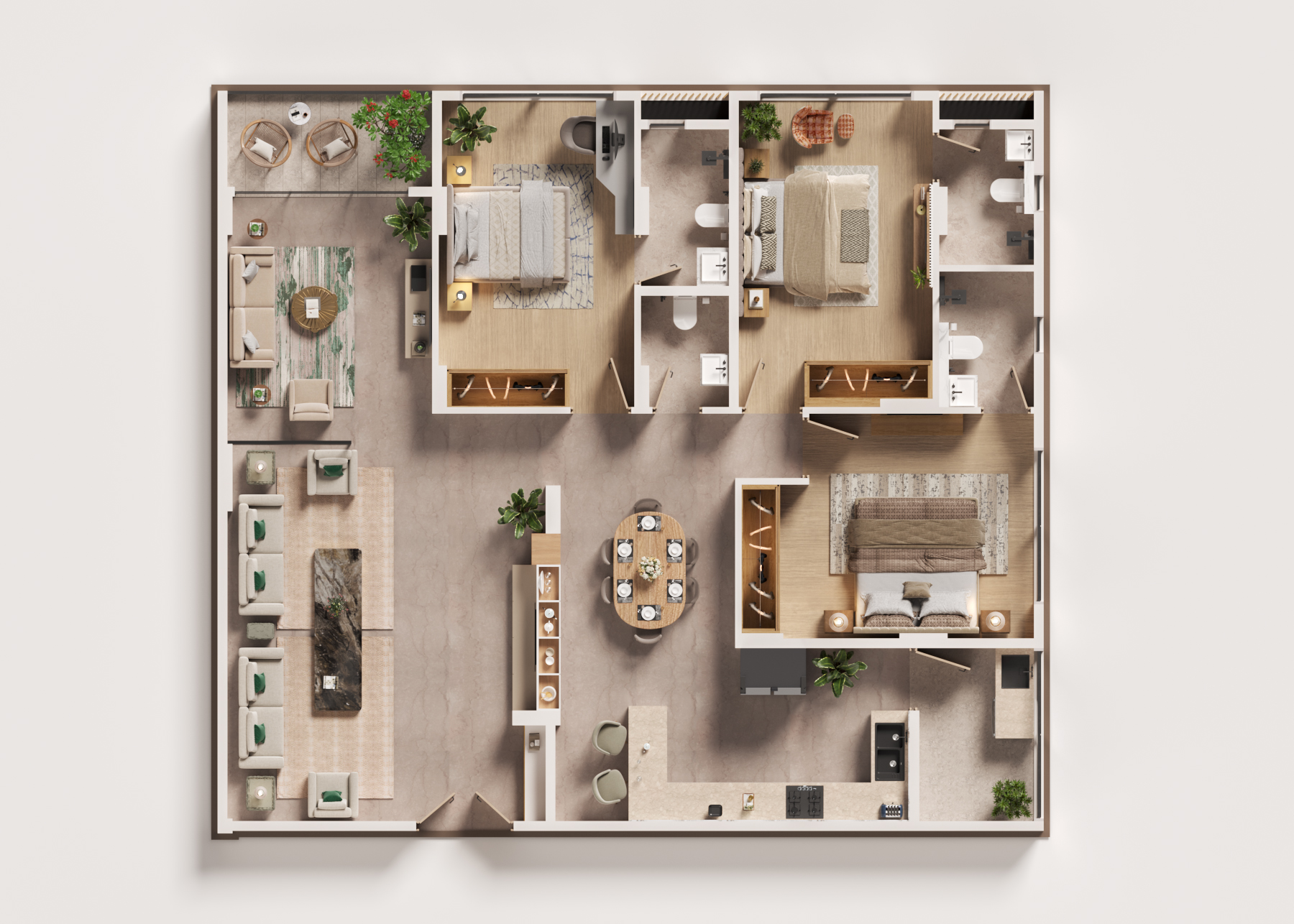 A well-planned 3BHK featuring 3 master bedrooms, a separate living hall, and a dedicated dining area.
