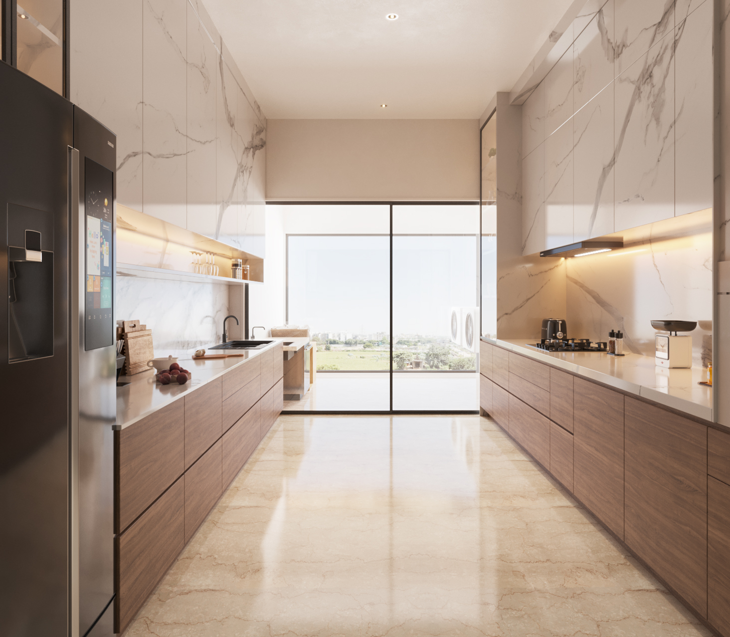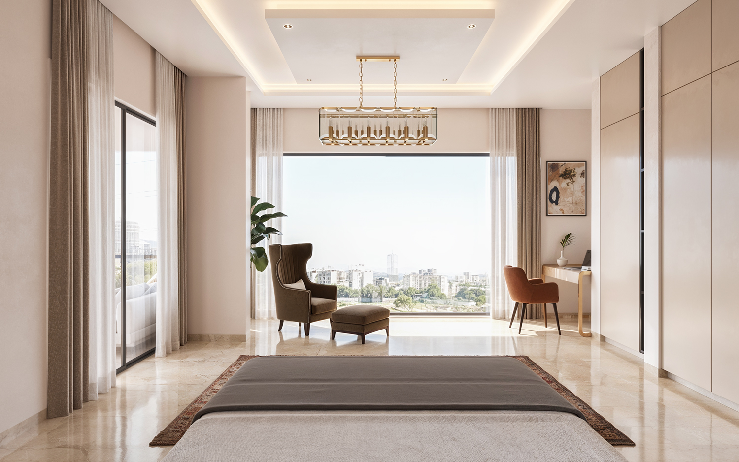 A 40 ft running balcony and expansive windows offer panoramic city views.